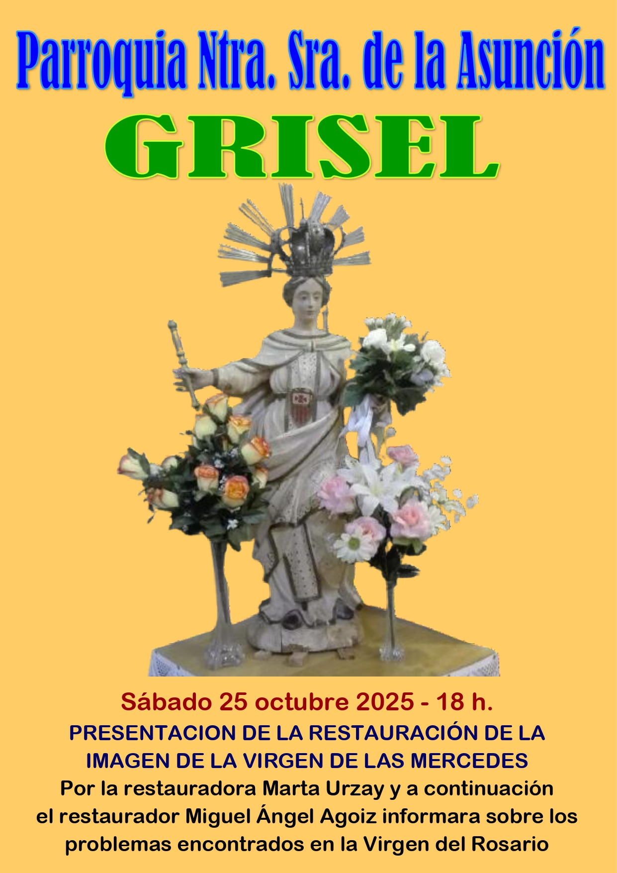 El próximo sábado 25 de octubre a las 18:00 tendrá lugar en Grisel la presentación de la Restauración de la Imagen de la Virgen de las Mercedes.